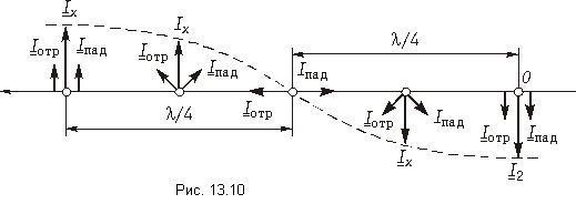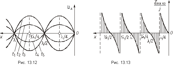 Сравнивая уравнения передачи (13.22) и (13.23) с уравнениями КЗ линии (13.20) и (13.21), видим, что полученные уравнения также являются уравнениями стоячих волн. Разница состоит в том, что узлы и пучности напряжения при XX совпадают с узлами и пучностями тока при коротком замыкании, а узлы и пучности тока разомкнутой линии – с узлами и пучностями напряжения КЗ линии. В конце разомкнутой линии образуется пучность напряжения и узел тока.