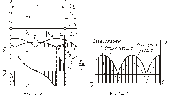 Из рис. 13.13 видно, что отрезок закороченной линии длиной меньше l/4 имеет входное сопротивление индуктивного характера. Поэтому всегда можно подобрать такую длину отрезка l¢, при которой его входное сопротивление равнялось бы заданному сопротивлению Zн. Заменим индуктивность Lн отрезком КЗ линии (рис. 13,16, б). Эта замена позволяет применить теорию КЗ линии и сразу же построить кривые распределения напряжения и тока в линии, нагруженной на индуктивность (рис. 13.16, в). В рассматриваемой линии возникают стоячие волны. Этот режим отличается от режима КЗ замыкания тем, что ближайший узел и пучность сдвинуты от конца линии на некоторое расстояние.