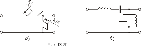 Полосовой фильтр. На сверхвысоких частотах, где потери в линии пренебрежимо малы, КЗ отрезки линии могут быть использованы для построения фильтров. В качестве примера на рис. 13.20, а показана схема полосового фильтра, построенного на двух КЗ отрезках линии. В продольное плечо схемы включен полуволновый отрезок, в поперечное плечо – четвертьволновый. Первый отрезок имеет входное сопротивление, аналогичное входному сопротивлению последовательного колебательного контура. Второй, четвертьволновый, отрезок играет роль параллельного колебательного контура. Эквивалентная электрическая схема фильтра дана на рис. 13.20, б