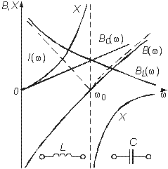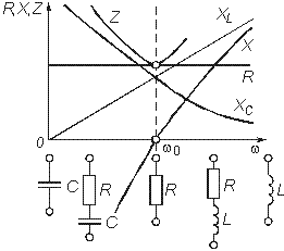 На резонансной частоте комплексное сопротивление носит чисто активный характер, т. е. Z = R, ток совпадает по фазе с приложенным напряжением и достигает максимального значения I0 = = U/R. Реактивные сопротивления контура на резонансной частоте