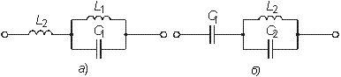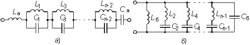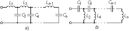 В схемах Кауэра двухполюсники представлены в виде цепочечных (лестничных) схем, в продольных ветвях которых находятся индуктивности, а в поперечных емкости (первая схема Кауэра, рис. 4.31, а), либо наоборот — в продольных емкости, а в поперечных — индуктивности (вторая схема Кауэра, рис. 4.31, б).