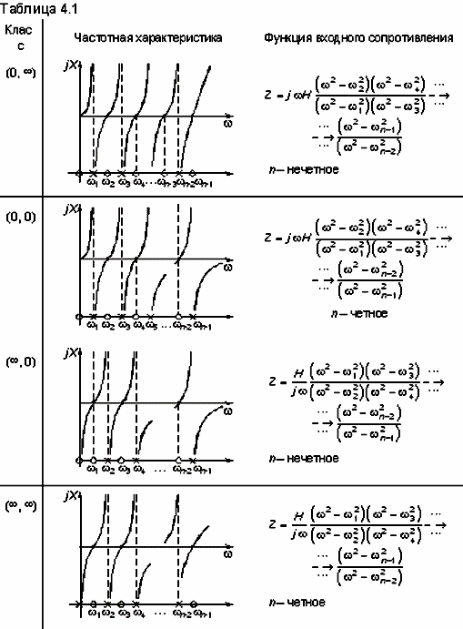В зависимости от класса канонические схемы Фостера и Кауэра имеют частотные характеристики входных функций, изображенные в табл. 4.1.