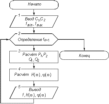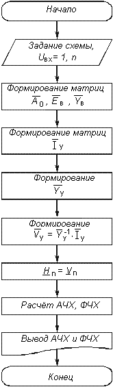 Затем на каждой из частот вычисляется АЧХ и ФЧХ цепи согласно формул (4.122) и (4.123). На рис. 4.32 приведена схема алгоритма расчета АЧХ и ФЧХ.