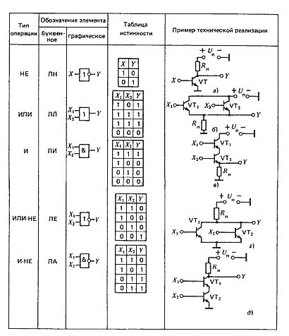 Основными логическими операциями являются операции инверсии (НЕ), сложения (ИЛИ), умножения (И), а также операции ИЛИ-НЕ и И-НЕ. Простейшие схемотехнические реализации этих операций приведены в табл. 3.1. Здесь же указаны условные буквенные и графические обозначения и соответствующие им таблицы истинности.