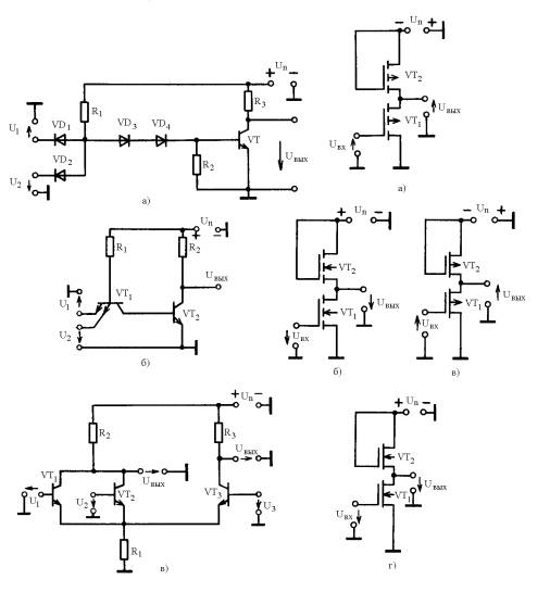Базовыми элементами любого логического устройства являются цифровые ключи на основе БТ и ПТ, особенности выполнения и работа которых рассмотрены в гл. 1.