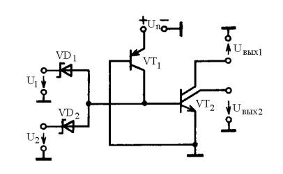Базовый ток, протекающий через диоды VD3, VD4, вызывает на них падение напряжении около 1,2 В. Вместе с напряжением на базе открытого транзистора это составит U=1,2 + 0,6=1,8 В. Если входное напряжение не превышает 1,2 В, соответствующий входной диод открывается, а напряжение U3 снижается. Следовательно, диоды VD3, VD4, а вместе с ними и транзистор VT закрываются.