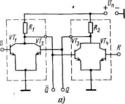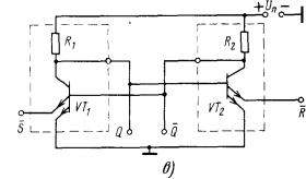 При наличии логической 1 на выходе одного инвертора на выходе другого поддерживается логический 0. Необходимые уровни напряжения на выходе издаются схемой управления, которая при использовании логических элементов семейства ТЛНС (см. рис. 3.7, а) образована транзисторами VT1 и VT2, а при использовании элементов семейства ТТЛ (см. рис. 3.7, в) образована эмиттерными переходами транзисторов VT1 и VT2. Триггеры, реализованные на основе логических элементов ИЛИ-НЕ, работают в положительной логике, а реализованные на основе логических элементов И-НЕ работают в отрицательной логике. Для работы в положительной логике схема управления последних усложняется добавлением двух инверторов.