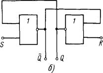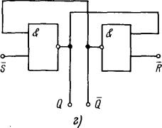 RS-триггер. Простейшим триггером является асинхронный RS-триггер. Такой триггер нетрудно реализовать на основе двух логических элементов ИЛИ-НЕ (рис. 3.7, а) или И-НЕ (рис. 3.7, в).