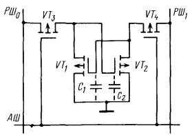 Для записи на адресную шину подают напряжение –Un, а на разрядные шины РШ1 и РШ0 подают уровни –Un и 0. Уровень –Un через ключ VT4 поступает на вход транзистора VT1 и открывает его. На затвор транзистора VT2 поступает уровень 0, и, следовательно, он закрывается. Напряжение на емкости С1 принимает значение uC1 = –Un, а на емкости С2 равно нулю (иC1=0). После записи отключают напряжение на адресной шине.