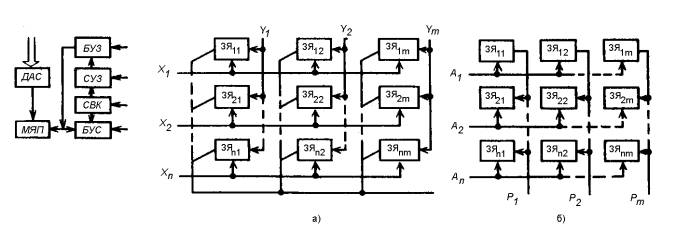 Дешифратор адресных сигналов (ДАС) при подаче соответствующих адресных сигналов осуществляет выбор требуемых ячеек памяти. С помощью РШ осуществляется связь МЯП с буферными усилителями записи (БУЗ) и считывания (БМС) информации. Схема управления записью (СУЗ) определяет режим работы БИС (запись, считывание, хранение информации). Схема выбора кристалла (СВК) разрешает выполнение операций записи-считывания данной микросхемы. Сигнал выборки кристалла обеспечивает выбор требуемой БИС памяти в ЗУ, состоящем из нескольких БИС.