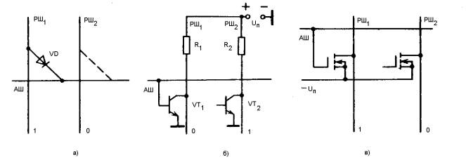 Диодные ПЗУ отличаются простотой, но имеют существенный недостаток, потребляют значительную мощность. Чтобы облегчить работу дешифратора, вместо диодов используют биполярные (рис. 4.7,6) и (рис. 4.7, в) транзисторы.
