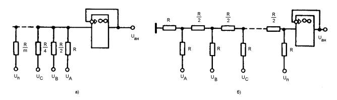 На цифровых входах UA, UB, UC, ... напряжение может принимать лишь два фиксированных значения, например, либо 0, либо 1. Для ЦАП, в котором используются резисторы R и R/2, требуется больше резисторов (рис. 4.10,6), но только с двумя номиналами. Аналоговое напряжение на выходе такого ЦАП определяется по формуле