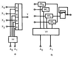 В микропроцессорных системах, АЦП, ЦАП, а также в системах электронной коммутации широкое применение находят мультиплексоры: многоканальные коммутаторы (имеющие 4, 8, 16, 32, 64 входа и 1—2 выхода) с цифровым устройством управления. Простейшие мультиплексоры цифровых и аналоговых сигналов показаны на рис. 4.12, а и б соответственно.